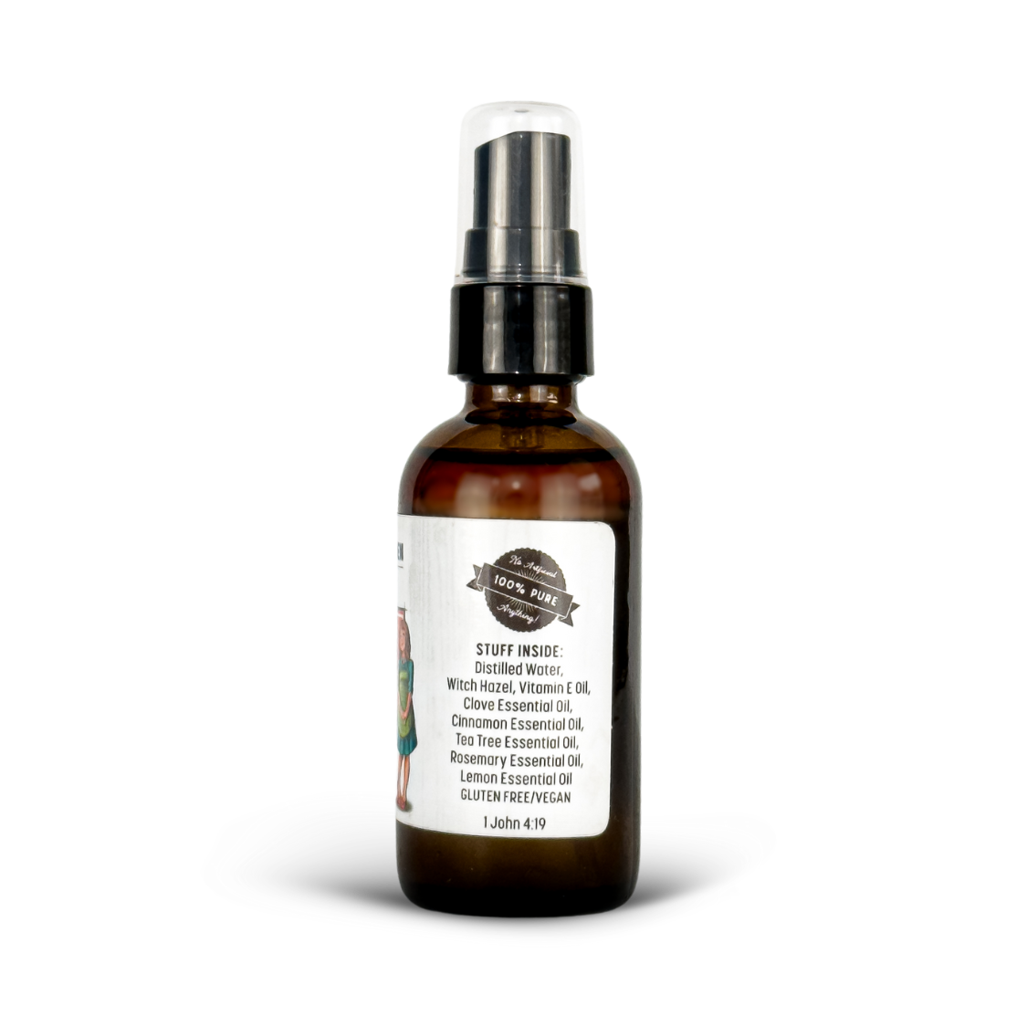 Made With: Distilled Water, Witch Hazel, Vitamin E Oil, Clove Essential Oil, Cinnamon Essential Oil, Tea Tree Essential Oil, Rosemary Essential Oil, Lemon Essential Oil